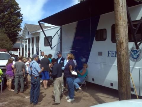 FEMA has opened a mobile disaster recovery center in nigh-flattened Prattsville. Above: A FEMA photo of people lining up for help at the mobile DRC on August 31, 2011.