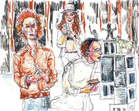 Illustration by Gary Mayer. Below, director Mollye Maxner hugs Lola Olson after opening night. Photo by Kirby Olson.
