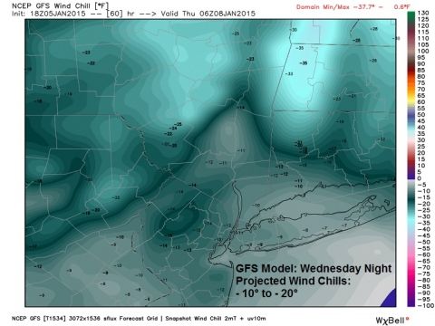 Above: A map of forecasted wind chill temperatures on Wednesday night, via Hudson Valley Weather.