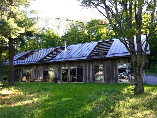 Beech Hill House resides in the enchanting and private Beaverkill Valley. Built with thoughtful detail, quality and craftsmanship, the house is unique in its sustainability aspects. Though connected to the grid to ensure 24/7 amenities, 75% of the house's electricity is supplied by the solar panels on the grounds. Most of the heat and hot water in the summer are supplied by solar thermal on the roof of the garage, and the building exterior and many interior walls are reclaimed barn and mushroom wood. Natural light floods the house through skylights and floor to ceiling windows, incorporating passive solar design.
