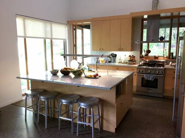Downstairs, the home features an open plan kitchen, with countertops made from recycled glass, dining room and living room. The Danish design fireplace is extremely efficient, and guests can enjoy mountain views while sampling an extensive vinyl collection with vintage turntable and speakers.