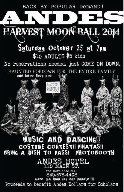 Back by popular demand! Andes’ Famous Harvest Moon Ball. $10 adults, $5 kids. Bring a dish to pass. Music, dancing, costume contest, photo booth, piñata and more fun than you can handle! No reservations needed. Just come on down. Proceeds to benefit Andes Dollars for Scholars.
