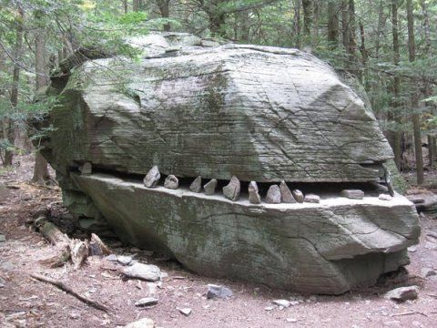Norman Muller, a contributor to a blog about rock piles (really!), came across this teeth-baring boulder near the site of the old Catskill Mountain House in Palenville this week and had to write about it: