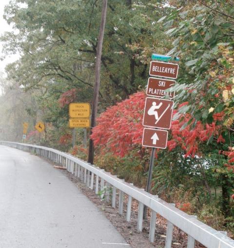 Thanks to the New York State DOT for ensuring that our local tourist attractions are well-marked. For instance, this sign on Route 28 in Shandaken, which appears to depict a hardy mountaineer skiing directly uphill on a 60-degree slope.