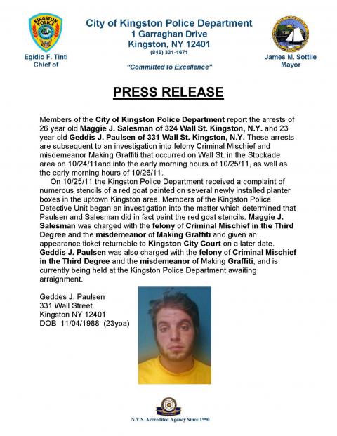 The Kingston Police Department issued a press release yesterday trumpeting the arrest of two people who allegedly are the masterminds behind the rash of red goats that have been popping up as graffiti around Kingston's Uptown District.