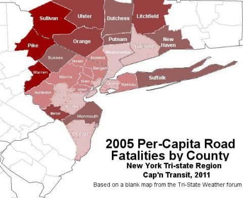 The public-transportation-promoting blog Cap'n Transit published an interesting (and disturbing) map on Sunday that shows that Sullivan County has more car crash fatatities per person than any other county in the New York Tri-State area.