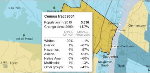 Detail of an interactive map from the New York Times, showing change of population between the 2000 and 2010 Census. According to the Census Bureau, a census tract including most of Saugerties (the darker brown area at center) lost 13.7 percent of its population in the last decade. Not really: It's the result of a ten-year-old error that the feds haven't fixed yet.