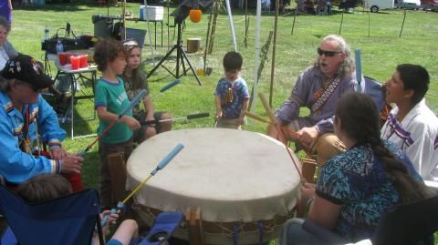 Children learn to drum at the Thunder in the Valley Pow-wow in Big Indian Park. Photo by Rusty Mae Moore.