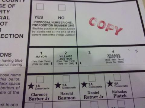 All those candidates will be listed on an old-fashioned paper ballot, which the village is using to save the cost of transporting voting machines. It's charmingly old school. The Liberty Independent, which is run by Piatek, who is running for village trustee, has a quick guide to how to use it (see image above).