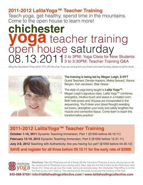 Yoga Teacher Training Open House, Chichester Yoga, located in the Post Office Building, Chichester, NY. Saturday, August 13. Yoga class 2pm, Q&A 3pm. www.lalitahealingcollective.com.