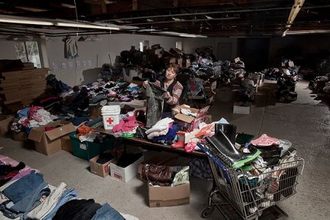 Above: Dorothy Maffei in an Arkville warehouse where she and teams of volunteers stored tons of clothing donated after Tropical Storm Irene. Photo by Christopher Auger-Dominguez.