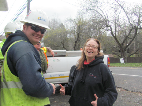Shauna Kanter of Wittenberg Road is extremely pleased with the Alliant crew. She is back on, and takes the time to say thank you (above) before scurrying back inside to get caught up on matters electronic.