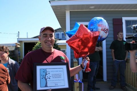 Floyd Guernsey III, owner of Guernsey's Schoharie Nursery, smiles for a TV camera at the nursery's grand re-opening ceremony on May 11. Photo by Donald Edmonds.