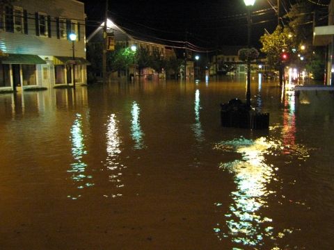 Top: Main Street Livingston Manor at 9pm, September 18, at approximately the high point of flooding. Photo by Kurt Knuth.