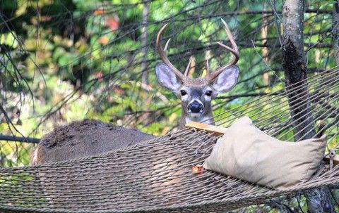 Lately I have seen a number of deer in my neighborhood and today I caught this one contemplating a nap in my hammock under our apple trees. He posed for this shot before he went on his way.