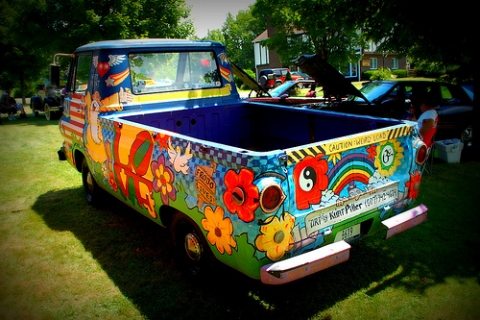 The pickup truck in the photo below is the work of local artist Kurt Piller. (Note the "Frodo Lives" and "Caution: Weird Load" slogans.) Piller has also worked on a series of psychedelic billboards leading to Secret Caverns, an underground cave and tourist attraction near Cobleskill.