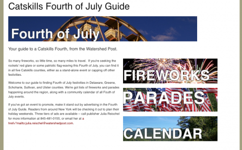 Our Memorial Day Guide was a big success last month -- it had 3,000 pageviews during its run and generated leads for local businesses. We know from experience that our coverage of Catskills fireworks is always a big draw, so we expect the Fourth of July Guide to do even better.