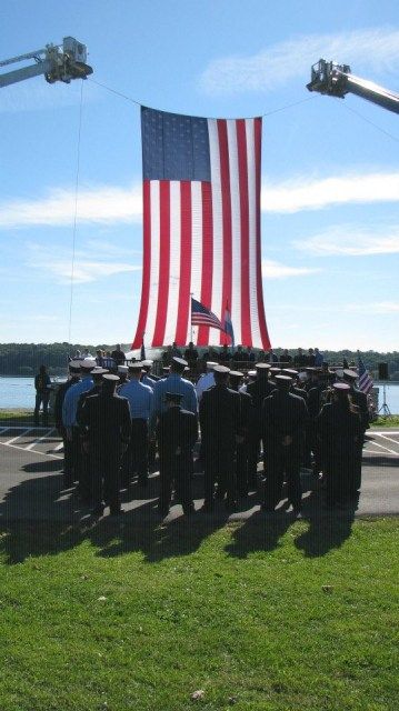 In Ulster County, police and first responders held ceremonies in Kingston and Ulster to honor and remember the victims of 9/11. In the photo above, Ulster County sheriff's deputies, New York State troopers, and firefighters from several local companies gather on the bank of the Hudson River in the town of Ulster.