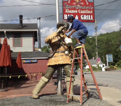 Phoenicia's larger-than-life Davy Crockett gets a bath, in preparation for his big move. On August 17, the statue -- which has stood for decades on Phoenicia's Main Street, in front of the Sportsman's Alamo Cantina -- is moving down the street to his new home in front of Mystery Spot Antiques. This being Phoenicia, the community is throwing a party for the occasion, with a Davy Crockett lookalike contest, prizes and a ukelele show.