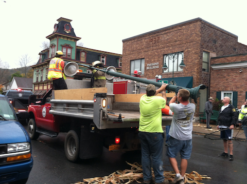 Below: The toppled streetlight gets loaded onto a Margaretville Department of Public Works truck. Photo by Lissa Harris.