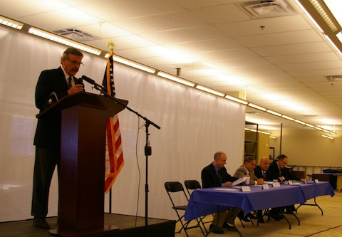 Below: Jim Eisel, the chairman of the Delaware County Board of Supervisors, speaks at a press conference at Amphenol Aerospace on March 18, 2014. Photo by Julia Reischel.