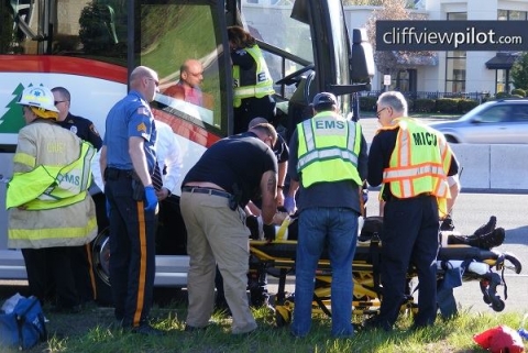 Above: An injured victim being treated at the scene of this morning's bus accident on Route 17 in Ramsey, N.J. Photos by Boyd A. Loving; courtesy of the Cliffview Pilot.