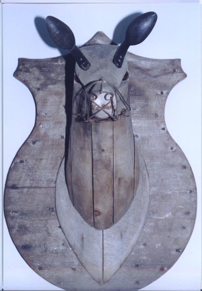 "Weather-Beaten, Angry And Disillusioned, Blitzen Flies No More," is the title of a sculpture resembling an irate reindeer made out of an antique wooden taxidermy form sporting two wooden spoons for years and and old dog muzzle on its snout. "Way Past Their Expiration Date" is the name on a glass jar stuffed with human heads recycled from old drugstore mannequins.