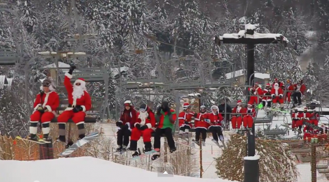 Above: Santas ride the chairlift on Sunday, Dec. 14 at Windham Mountain Ski Center. Screenshot from Windham Mountain's video of the event, which you can watch below.