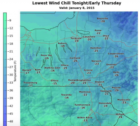 Above: Forecasted windchill temperatures for Thursday, Jan. 8, from the National Weather Service's Binghamton office.
