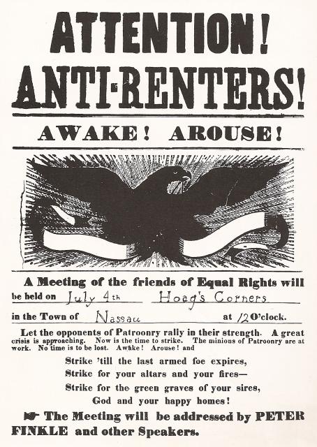 Left: Awake! Arouse! Dance! An 1839 poster supporting the Anti-Rent movement in Nassau, New York. From Wikimedia Commons.