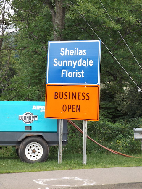 Above: Contractors put up signs letting Kingston Street travelers know that the flower shop is open during construction. Photo by Robert Cairns.