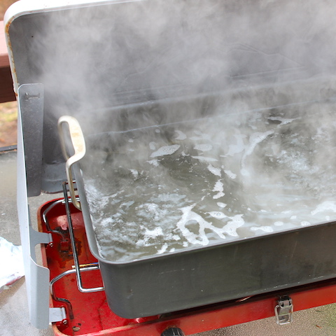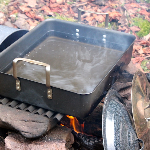 - Use flat (stainless steel or aluminum) pans over a heat source to boil off the majority of moisture. You can use a wood fire, a gas grill, a camping grill, or any other heat source to start the process outside.