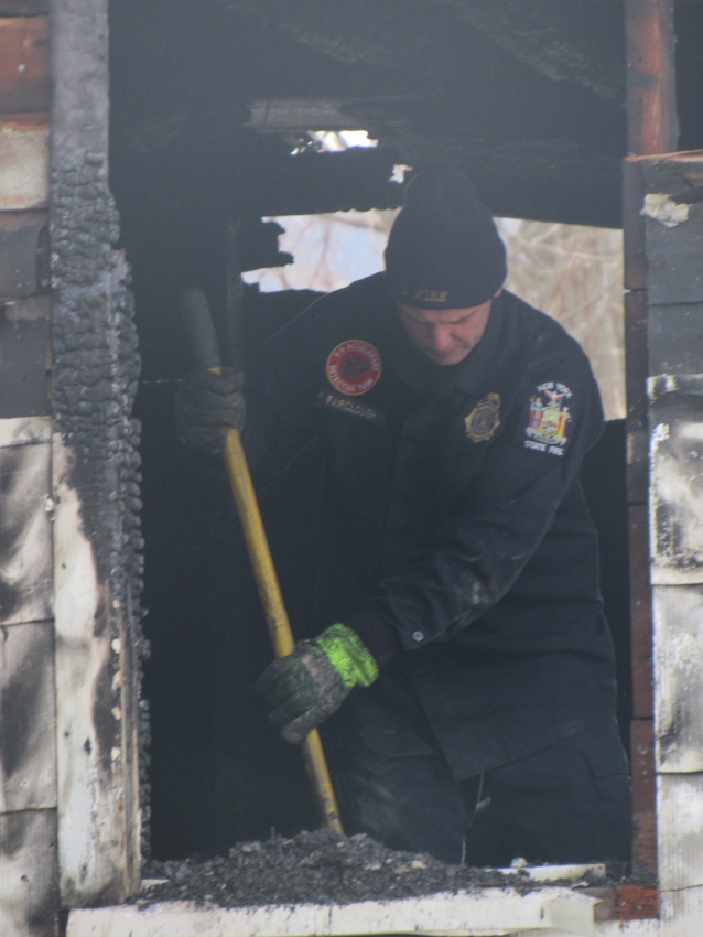Above: An investigator from the New York State Office of Fire Prevention and Control searching for clues to the origin of the fire on Monday afternoon. Photo by Robert Cairns.
