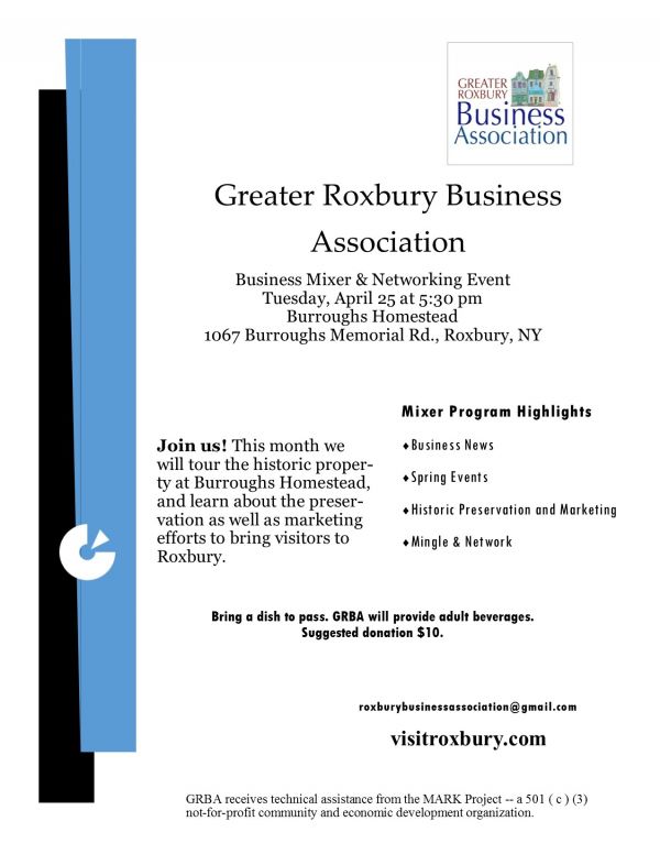 Greater Roxbury Business Association (GRBA) invites you to its business mixer and networking event Tuesday, April 25 at 5:30 p.m. at Burroughs Homestead, 1067 Burroughs Memorial Rd., Roxbury, NY.