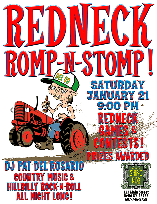 A night full redneck games, country music and hill-billy rock-n-roll. Pat Del is your host for this fun-filled and action packed events. Games include but not limited to the following, Tobacco spitting contest, best redneck talk, nerf style bow and arrow, can stack, and the list goes on.
