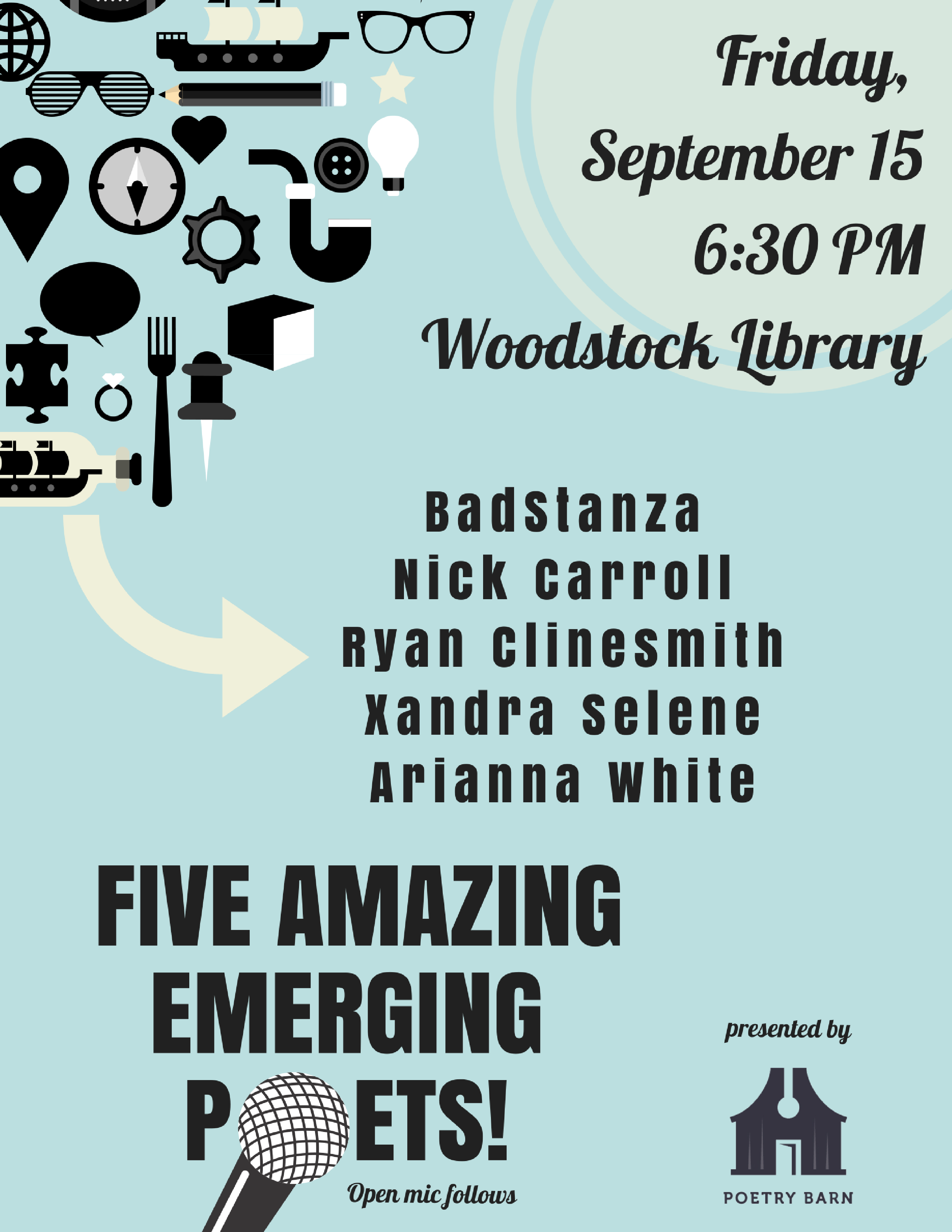Poetry Barn is delighted to present five bright new stars rising on the poetry horizon and enlivening Kingston’s new Midtown Arts District (MAD): BadStanza, Nick Carroll, Ryan Clinesmith, Xandra Selene and Arianna White. An open mic follows. If you have poems, songs, stories, to share, you are warmly welcome to sign up before the reading.