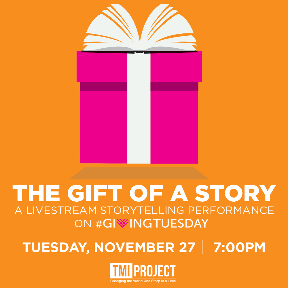 Join TMI Project on #GivingTuesday as we kick-off our annual appeal with The Gift of a Story, an intimate evening of true storytelling and conversation, presented in person and via live stream. The storytelling salon, featuring a selection of true stories from TMI Project’s workshop leaders, will be live streamed on Facebook Live, allowing a global audience to connect with and participate in the stories and conversation.
