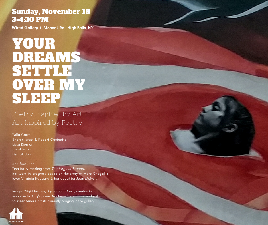 Please join Poetry Barn and Wired Gallery on Sunday, November 18, at 3 PM for an afternoon of poetry and art in conversation. Presenting new work from Willa Carroll, Robert Cucinotta, Sharon Israel, Lissa Kiernan, Janet Passehl, Lisa St. John and featuring Tina Barry reading from her work-in-progress The Virginia Project, prose poems based on the story of Marc Chagall’s lover Virginia Haggard and her daughter Jean McNeil. Fifteen works of art created by women artists in response to Barry’s poems will be on display in the gallery.
