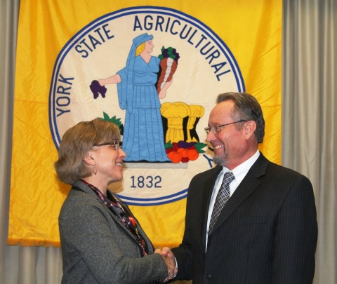 Above: New York State Agricultural Society President Diane Held congratulates Schoharie County farmer Richard Ball, recently appointed as New York State's new Commissioner of Agriculture, at the group's 2014 forum on New York agriculture. Photo from the New York State Agricultural Society's Facebook page.