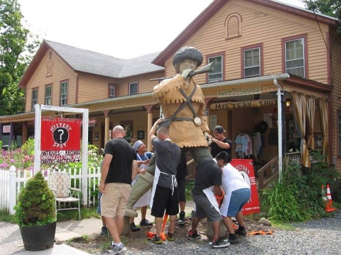 A crew of employees from the Sportsman's Alamo Cantina gets Davy Crockett settled into his new home at Mystery Spot Antiques, next door to the Cantina on Phoenicia's Main Street. Photo from the Mystery Spot's Facebook page.
