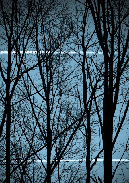Parallel contrails through winter trees in Monticello on December 14, by Catskills Photography via the Watershed Post Flickr pool.