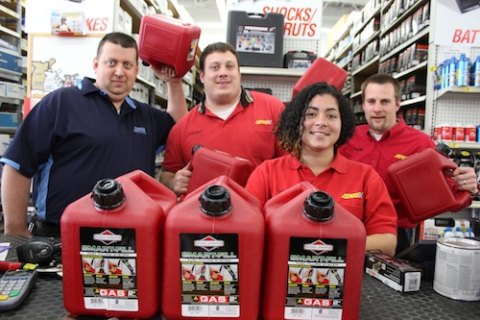 Above: Manager Brian McDonald (left) of Advance Auto Parts in Liberty and his staff tracked down gas cans – a hot commodity across the tri-state area. Photo by Jason Dole.