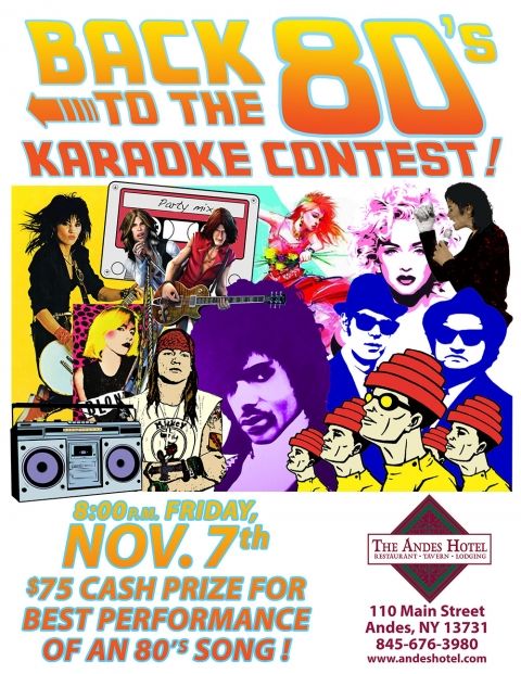 11.7-KARAOKE-8pm-No cover. 80s Contest. $75 for best 80s song performed. This Sponsored Story is paid advertising. See more information about Andes Hotel.Tags: 11.7-KARAOKE-8pm-No cover. 80s Contest. $75 for best 80s song performed.Place: Andes