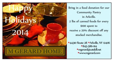 Holiday Store Hours: Monday, Thursday, Friday, Saturday from 10AM to 5PM Sunday from 10AM to 3PM This Sponsored Story is paid advertising. See more information about Mgerard.Tags: interior designcandlesjewelryscarvesrugsSofasFurnishingsarm chairsreclinersside tablescoffee tablesdinnerwareserving warecandelabraswindow treatmentsdecorative pillowscustom upholsterydining tableswomen’s accessoriesPlace: Delaware CountyUlster CountySchoharie CountySullivan CountyGreene CountyAndesBovinaColchesterDavenportDelhiFranklinHamdenHancockHarpersfieldKortrightMasonvilleMeredithMiddletownRoxburySidneyStamfordTompkinsWaltonDenningEsopusGardinerHardenburghHurleyKingstonLloydMarbletownMarlboroughNew PaltzOlivePlattekillRochesterRosendaleSaugertiesShandakenShawangunkTown of KingstonTown of UlsterWawarsingWoodstockHalcottClaryvilleSundownDownsvilleDavenport CenterWest DavenportTreadwellCadosiaEast BranchFishs EddyBloomvilleEast MeredithMeridaleArkvilleFleischmannsHalcottsvilleMargaretvilleNew KingstonGrand GorgeSidney CenterHobartSouth KortrightKelseyTrout CreekConnellyPort EwenRiftonSaint RemyUlster ParkWest ParkGlenfordOld HurleyWest HurleyHighlandHigh FallsStone RidgeMiltonAshokanBoicevilleKrumvilleOlivebridgeShokanWest ShokanClintondaleModenaAccordKerhonksonBloomingtonCottekillTillsonGlascoMalden-on-HudsonMount MarionWest CampBig IndianChichesterHighmountMount TremperOlivereaPhoeniciaPine HillWalker ValleyWallkillEddyvilleLake KatrineRubyCragsmoorEllenvilleGreenfield ParkNapanochSpring GlenBearsvilleShadyWillowHunterTannersvilleLivingston ManorPalenvilleWindhamThompsonMonticelloLibertyGreenvilleNew BaltimoreCairoNeversinkWillowemocRocklandRoscoeDepositStamfordBlenheimBroomeCarlisleCobleskillConesvilleEsperanceFultonGilboaJeffersonMiddleburghRichmondvilleSchoharieSewardSharonSummitWrightCobleskillEsperanceMiddleburghRichmondvilleSchoharieSharon SpringsBreakabeenCharlottevilleEminenceGallupvilleLivingstonvilleSloansvilleAshlandAthensAthensCatskillCoxsackieCoxsackieDurhamHalcott CenterHunterJefferson HeightsJewettLeedsLexingtonNew BaltimorePrattsvilleNorth BranchNarrowsburgRock HillSmallwoodSouth FallsburgTustenWoodbourneWoodridgeWurtsboroYoungsvilleBethelCallicoonCochectonDelawareFallsburgForestburghFremontHighlandLumberlandMamakatingBarryvilleBloomingburgCallicoonDivine CornersEldredGlen WildGrahamsvilleHarrisHasbrouckHurleyvilleJeffersonvilleKenoza LakeLoch SheldrakeMountaindaleLong EddyHarvard