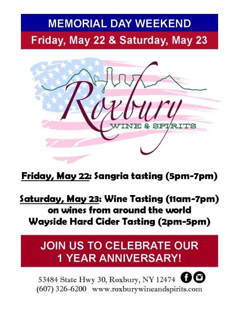 Saturday, May 23, 11-7pm wines from around the world tasting; Wayside Cider tasting 2-4pm