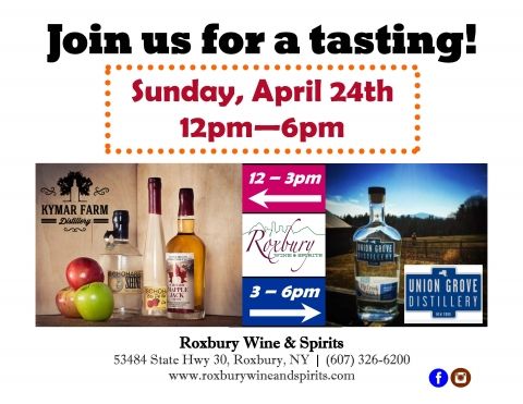 Please join us as we kick off Restaurant Week (sponsored by Catskill Mountain News) for a FREE TASTING! This Sunday, April 24, Noon-6pm. KyMar Farm Distillery will be in the store pouring their libations 12-3pm followed by Union Grove Distillery sampling their latest batch of Vly Creek Vodka, 3-6pm. Be sure to make your reservations for brunch at Roxbury Arts Group deliciously prepared by Ate-O-Ate Gourmet Food Truck! Come enjoy a boozy brunch in Roxbury!