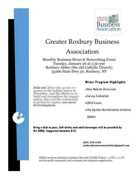 This is a potluck event: please, bring along a dish to pass. Soft drinks and adult beverages will be provided by the GRBA. The event is free and open to the public. A suggested donation of $10 will help GRBA advance its mission to continue to foster economic development opportunities in Roxbury. For more information, call (845) 254-3103 or email [email protected].