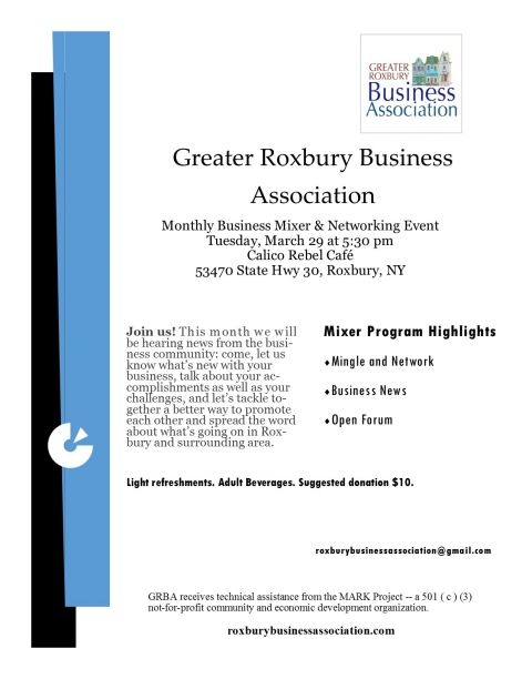 Greater Roxbury Business Association (GRBA) invites you to its monthly business mixer and networking event Tuesday, March 29 at 5:30 p.m., at Calico Rebel Café, 53470 State Hwy 30, Roxbury. GRBA welcomes the opening of this new downtown business, and wishes the owners Andy McArdle and Mary Ann Warren the best of luck! We are looking forward to experiencing the Calico Rebel Café’s excellent lunch menu, in a completely re-designed, re-configured space. The café will soon have its own liquor license, and will begin serving dinner too.