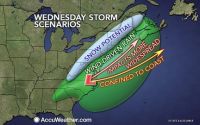 Above: AccuWeather graphic showing potential scenarios for a storm that's slated to move up the coast toward the Northeast next week, just in time for Thanksgiving. For more on that, see AccuWeather's Friday story about the storm.