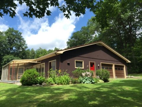 This mod Catskills home is set on a very quiet country road, walking distance to thousands of acres of preserved land with hiking trails. Built in 1968, it has 4 bedrooms, each with glass sliding door, 2 full baths (one is en suite with the master bedroom), and a very large open plan kitchen, dining, living area that is 47' x 18'. It has 3 sets of sliders, 2 of which are 16' wide each, south-facing, which flood the room with light. That south-facing orientation is handy for the solar panels, which greatly minimize the annual electric bill. The fireplace insert also provides an appealing additional heat source to the propane-fired baseboard heat.